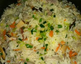 - 1. 电饭锅淘米加入水,放入原先剪好且洗过的鱿鱼,加入一小勺半的盐,再加入适量的猪油煮熟