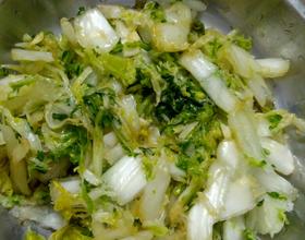 白菜捏干水分,加入生抽,花生油,蒜泥,搅拌就可以食用。喜欢辣的可以加进辣椒