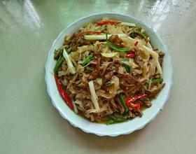 - 7. 锅里放食用油.7成熟放入肉丝.困花椒.蒜.老姜丝.青椒红椒.爆炒入味.