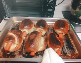 然后发酵一小时至2.5倍大,分成六份,盖上保鲜膜继续10分钟发酵