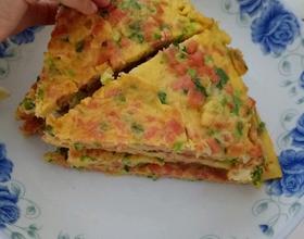 热油,油温到达一定程度把之前拌好的蛋液倒入锅里,火不要太大,鸡蛋饼变色变硬就可以起锅装盘了