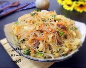 胡萝卜用油炒一下便于其中的营养能更好的吸收,粉丝烫熟后用油拌一下以免粘在一起。