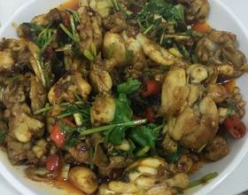 放入炸好的牛蛙继续爆炒三分钟,中途放入料酒,盐,鸡精,再加入剩余香菜和香葱。