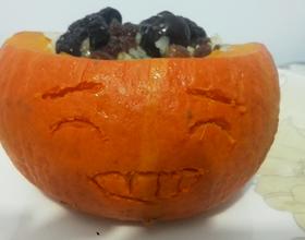 南瓜挖空,把提前泡好的糯米,红枣,葡萄干搅和匀,倒在南瓜里。