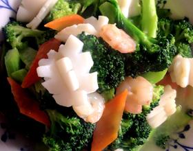 依次加入鱿鱼块,虾仁翻炒,加人盐,鸡精,糖。最好加入调好的马铃薯水。
