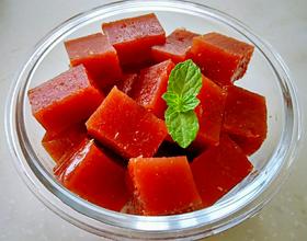 稍微放凉的山楂酱装入饭盒,压平,压紧实。放入冰箱冷藏一夜,倒扣出来,切块。