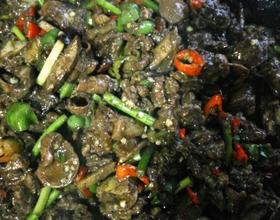 - 8. 将内脏煸炒后放至一旁,倒入姜,辣椒,蒜苔,煸炒