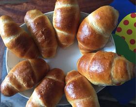 我试吃了一个,外面酥脆,里面软而绵劲。就是底部其实烤得比上面颜色还深些,估计再烤一分钟就糊了有苦味了。幸亏关火及时。最后我的面包还是成功的!哇咔咔咔咔。。。。