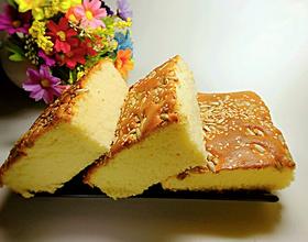八寸方形烤盘刷油,倒入蛋糊,刮平,洒上瓜子仁和白芝麻