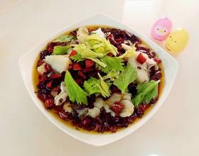 锅中放适量油,烧至七成热,将干辣椒花椒放入锅中,翻炒至辣椒成棕红色。即可关火,将油一起淋在鱼片上。