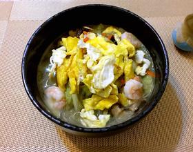 烧锅开水,把粉丝和炒好的菜放进去。之前炒菜用过油,就不用再加了。虾仁最后加进去,放盐、鸡精调下味。最后用放点味达美提提鲜。