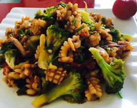 - 5. 待西兰花熟了,倒入鱿鱼块,放入盐、料酒、生抽炒匀撒上香菜出锅即可。(怕上火的可加入一点点水炒匀翻几下再出锅)