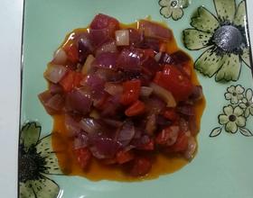 准备洗净的洋葱和番茄,洋葱切成小块,番茄去皮切成小块。(忘记拍照了)