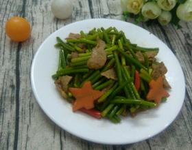 瘦肉五六分熟的时候把蒜芯也放下去一起爆炒,翻炒一会就可以起锅。蒜芯是焯过水的容易熟。