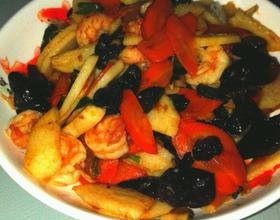 再下木耳,最后下山药,炒的差不多起锅时下葱段虾仁,下适量的盐蚝油糖再大火炒入味,就可以起锅了