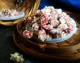 马上筛入玉米淀粉,不能太多,快速翻炒使每粒花生都裹上淀粉,翻炒至淀粉凝固,马上关火
