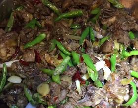 下油,把除料酒青椒的所有材料一起下锅,香味溢出