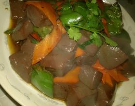 在到了切好的青椒红椒,蒜苗,葱,倒入少许料酒,生抽,老抽。最后倒,烫好的猪血,翻炒三至五分钟