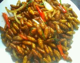 用油把茧蛹炸成金黄色外皮硬些,不要过老,油温不能过高,炸好时会有味道出来,即可捞出备用