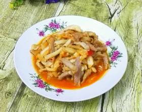 热锅起油放入生姜,倒入肉丝和料酒煸炒
