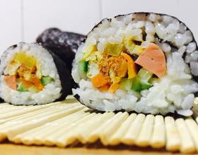 - 4. 将各种条条依次放在米饭上面如图,然后卷起来边卷边压实这样不容易散开,切的时候刀用水沾湿容易切好。