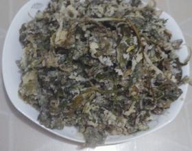 在把食用油2匙倒入装有蒲公英的盆里搅拌均匀,在把面粉洒入盆里让蒲公英裹满面粉