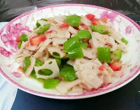 锅里放油烧热后放入姜蒜,倒入藕,青椒胡萝卜一起炒,三四分钟后放适量的盐和鸡精