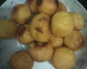 地瓜蒸熟,凉凉,用勺子压成泥,加入白糖,可以尝尝甜度,因为地瓜是熟的,这步忘了照相啦,加入江米面