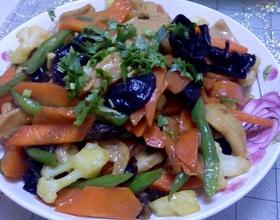 做锅放油,所有的菜倒入锅中翻炒。分别放入盐,酱油。炒熟后放些团粉勾芡,最后淋上香油。