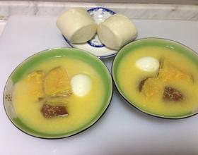 煮熟的玉米面红薯鸡蛋粥盛在碗里 这道粥就做好了