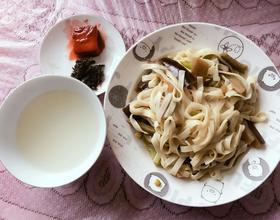 最好使用圆的面条,或者是拉面宝宝家中没有了,只能用宽的挂面代替