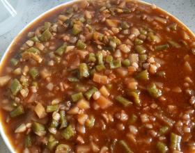 - 4. 加备好的土豆丁豆角丁(有点胡萝卜丁更好,蒜台什么的各种蔬菜都可以,)继续翻炒,加番茄酱和盐,