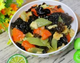 木耳要提前泡发洗净,青笋,胡萝卜,木耳要过热水焯水。