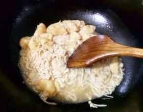 油热爆香蒜片放入金针菇,油豆腐一起炒