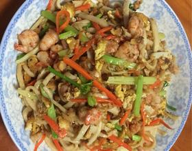将鱼面炒熟后加入炒熟的瘦肉,虾仁,香菇,鸡蛋丝,红萝卜丝,翻炒均匀后加入葱段胡椒粉。