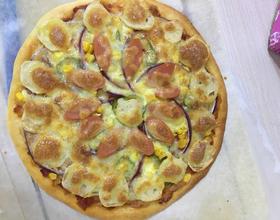 加入披萨酱再加一层奶酪,再加洋葱青辣椒玉米