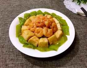虾去头去壳去虾线后加入料酒、盐腌制备用,豆腐切小块,青尖椒去籽切成小块,姜、蒜切末