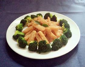 倒入山药条翻炒均匀,盛入盘中,用焯好的西兰花装饰一下。