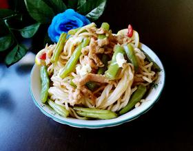 肉丝变色后,加入扁豆,料酒、生抽、糖、盐煸炒;