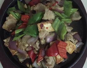 - 2. 热锅凉油放入豆腐煎至两面金黄取出备用,锅底留余油下五花肉小火煸炒,煸炒出香味吐油下豆瓣酱炒出红油,下姜片,蒜和豆豉炒出香味,下适量清水小火焖煮,调入适量盐,糖,味王,料酒,胡椒粉,下洋葱,青红椒,放入煎好的豆腐,翻炒均匀,下水淀粉勾芡,。