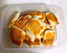 半小时后从冰箱取出来切成小块,再简单塑形成厚薄适中的小正方形,刷上蛋黄液,撒上熟白芝麻,放进烤箱中层175度烤20分钟,之后再焖10至20分钟