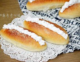 液体量请根据自家面粉吸水性来灵活运用。没有淡奶油的朋友可以换成牛奶,用量减掉8g。觉得挤奶油夹心麻烦的话可以换成卡士达酱或者果酱,当然也可以什么也不加直接当餐包一样好吃,我这里既然是复制童年味道,自然挤奶油啦!表面的砂糖吃起来是甜甜且咯吱咯吱滴,不喜欢的朋友可以不放或者换成椰蓉。以上方子来自红叶99。