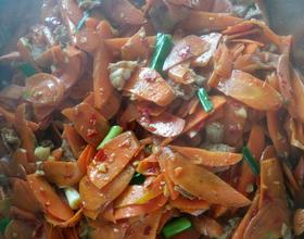 锅里放点油肉爆炒一下后,放油炒调料槽辣椒和糍粑辣和豆瓣酱和鸡精和味精和盐炒好调料后,放肉炒一下