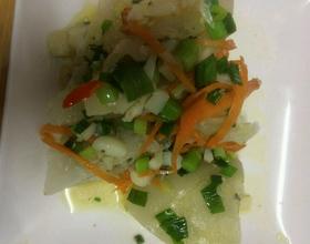 配料设好待用,胡萝卜丝,蒜蓉,蒜苗,辣椒