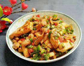 如果动作不够熟,可把豆腐片先用盐水泡一会