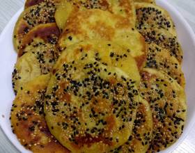 盘内准备好芝麻,把切好的面段用手做成圆饼,在正背面粘上芝麻