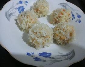 - 4. 把搅拌好的肉末滚成圆子,再把圆子放到糯米去滚一圈,如下图: