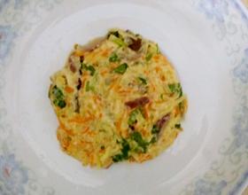 将炒好的土豆胡萝卜丝摊凉,加入面粉、葱花、香菜末、盐、胡椒粉、鸡精,搅拌均匀。