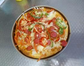 - 4. 放入九寸披萨盘中。用叉子在饼皮上叉些小孔。
