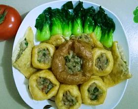 - 3. 把大的三角形油豆腐对半切开成两个三角形,再把切口慢慢剥开似口,正方形油豆腐在其中一方用筷子戳个口待用。